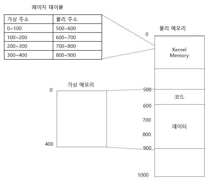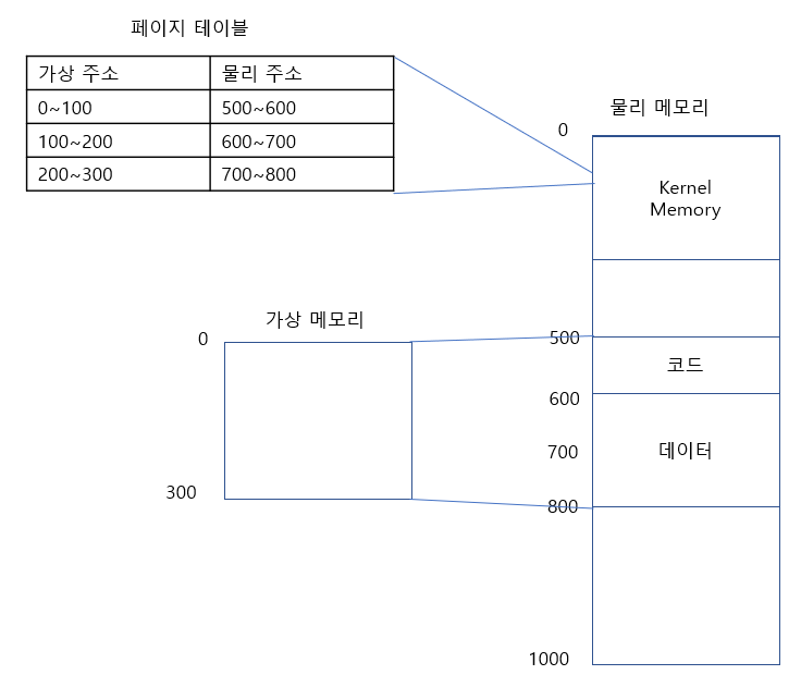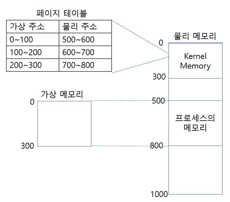 커널은 내부적으로 '페이지 테이블' 이라는 표를 가지고 있어, 가상주소 <-> 물리주소 변환을 진행해 준다.