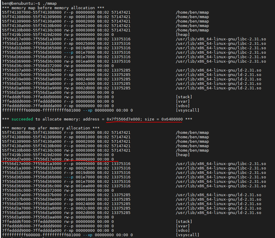 그리고 그 전에는 존재 하지 않았던, "7f5566d7e000-7f556d17e000 rw-p 00000000 00:00 0"이라는 메모리 영역을 나타내는 행이 추가 되었다. 이 부분이 새로 확보된 메모리 영역이다.