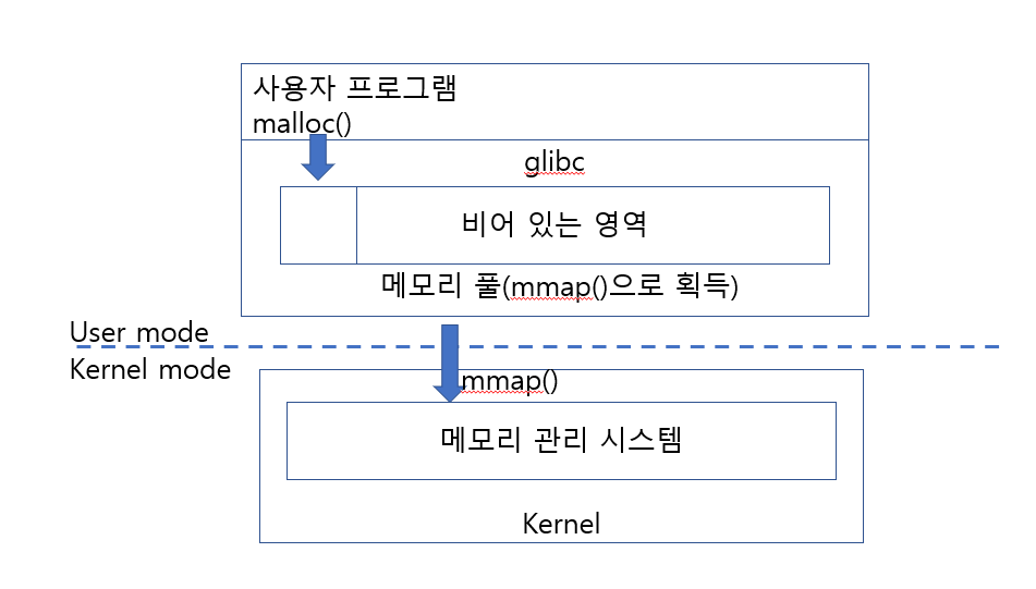 실제로 C에서는 malloc() 으로 메모리를 할당하며 이때 byte 단위로 할당 된다. 하지만 glibc 는 내부적으로 mmap() system call을 사용하여 page 단위로 memory 를 할당 받는다. 이처럼 요청 받는 단위와 실제 할당 받는 단위이 비대칭을 극복하고자 glibc 는 사전에 mmap() 를 통해 커다란 메모리 영역을 확보하여 메모리 풀을 만들고, malloc()이 호출 되면 메모리 풀로 부터 필요한 양을 바이트 단위로 잘라내어 반환하는 처리를 한다. 풀로 만들어 둔 메모리에 더이상 빈 공간이 없으면 다시 한번 mmap()을 호출하여 새로운 메모리 영역을 확보한다.