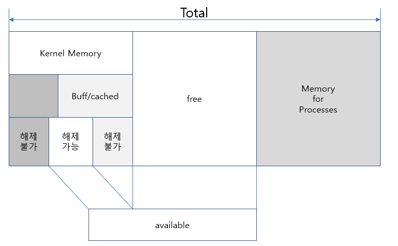 available : 실질적으로 사용 가능한 메모리. free 필드값의 메모리가 부족하면 해제되는 커널 내의 메모리 영역 사이즈를 더한 값이다. 해제될 수 있는 메모리에는 버퍼 캐시나 페이지 캐시의 대부분 혹은 다른 커널 내의 메모리 일부가 포함된다.