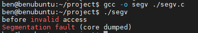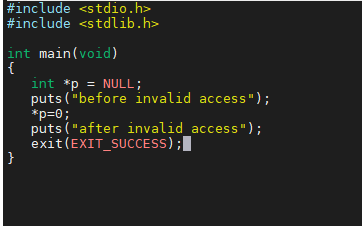 다음과 같이 code 를 짜고 실행하면, Seegmentation fault" 가 발생한다. 해당 프로세스가 SIGSEGV 시그널을 받았기 때문이다.
