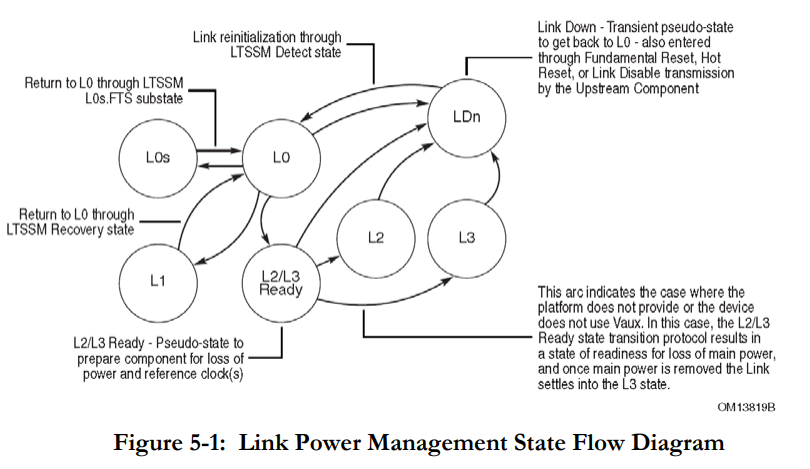 PCI Express는 PCI 버스 전력 관리 인터페이스 specification에서 정의된 버스 전력 관리 상태를 대체하는 링크 전력 관리 상태를 정의합니다. 링크 상태는 PCI-PM 레거시 호환 소프트웨어에서는 보이지 않으며 해당 링크에 연결된 구성 요소의 전력 관리 D-상태에서 파생되거나 ASPM 프로토콜에 의해 파생됩니다(5.4.1 절 참조).