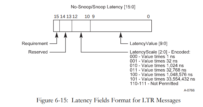 No-Snoop Latency and Snoop Latency: As shown in Figure 6-15, these fields include a Requirement bit that indicates if the device has a latency requirement for the given type of Request. If the Requirement bit is Set, the LatencyValue and LatencyScale fields describe the latency requirement. If the Requirement bit is Clear, there is no latency requirement and the LatencyValue and LatencyScale fields are ignored. With any LTR Message transmission, it is permitted for a device to indicate that a requirement is being reported for only no-snoop Requests, for only snoop Requests, or for both types of Requests. It is also permitted for a device to indicate that it has no requirement for either type of traffic, which it does by clearing the Requirement bit in both fields.