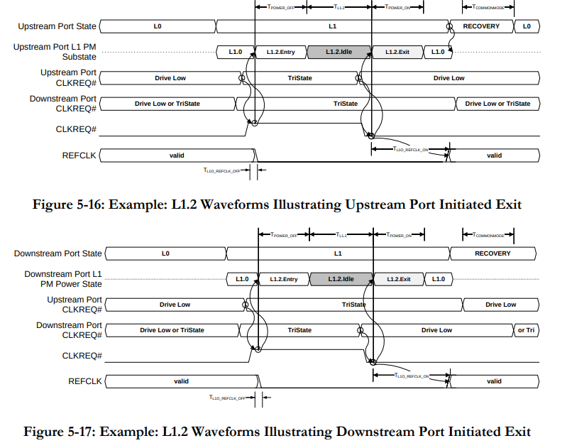 Figure 5-16 illustrates the signal relationships and timing constraints associated with L1.2 entry and Upstream Port initiated exit.