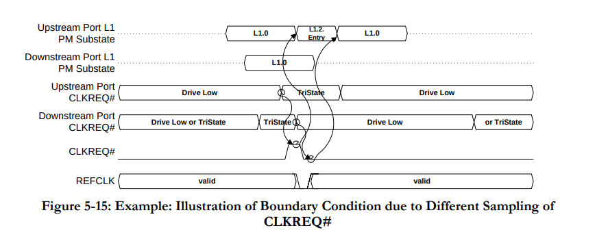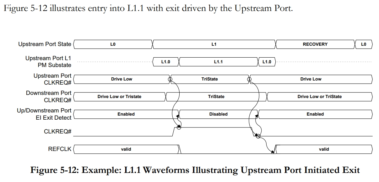 enters L1 (L1.2로의 진입을 차단하려는 다운스트림 포트는 - 즉 디바이스는- 링크가 L1으로 진입하기 전에 CLKREQ#를 Low 로 내리 깔아야 합니다.) - When CLKREQ# is de-asserted the Ports enter the L1.2.Entry substate of L1.2. (CLKREQ#이 High 로 들리면, 포트는 L1.2의 L1.2.Entry 하위 상태로 들어갑니다.)