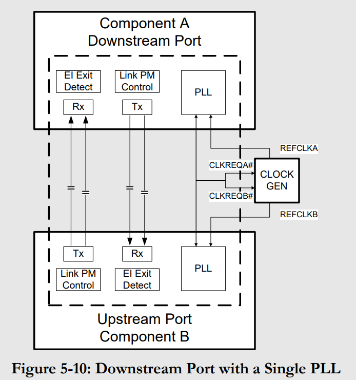 In this platform configuration the Upstream component (A) has only a single CLKREQ# signal. The Upstream and Downstream Ports’ CLKREQ# (A and B) signals are connected to each other. In this case, Upstream component (A), must assert CLKREQ# signal whenever it requires a reference clock.