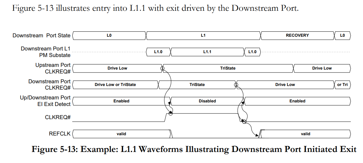 - When in ASPM L1.0 and the ASPM L1.1 Enable bit is Set, the L1.1 substate must be entered when CLKREQ# is de-asserted and the conditions for entering the L1.2 substate are not satisfie