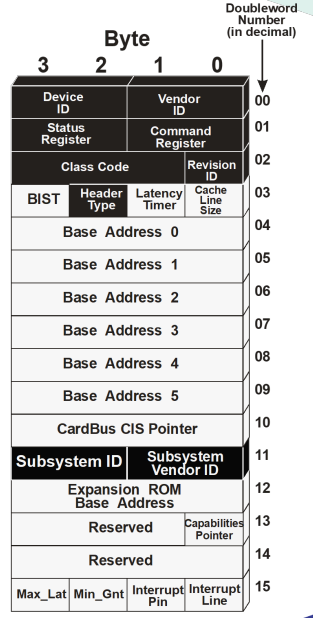 - Device 당 256바이트 또는 4K 바이트의 configuration space 공간