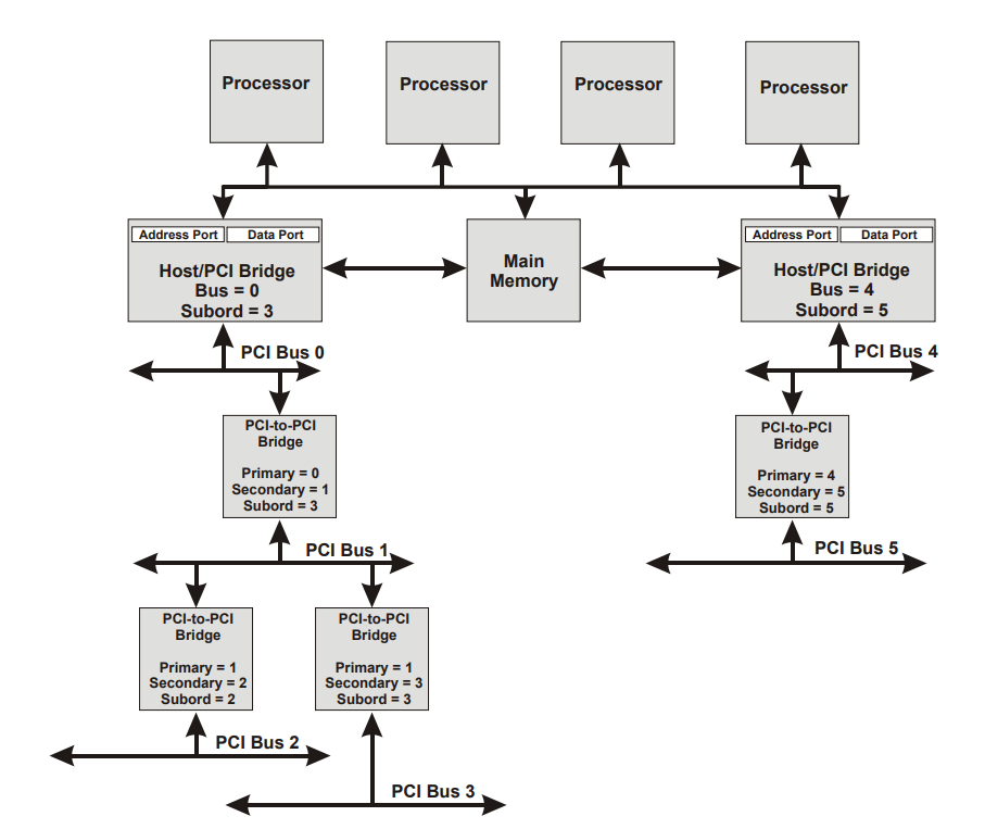 - "Type 0" (동일한 bus #) 와 "Type 1" (다른 bus #) configuration cycle 을 통해 주소가 지정됨
