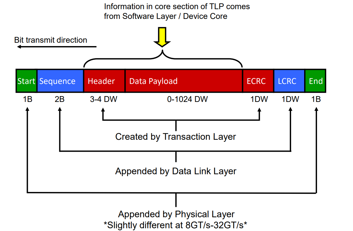 - 8B CRC (Cyclic Redundancy Check): 오류 검출을 위한 CRC 필드로, TLP와 DLP 전체를 검증하여 데이터 전송 중 오류를 감지합니다.
