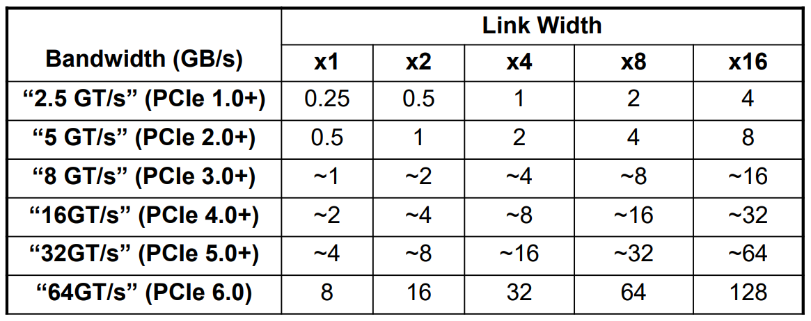 - PCIe 5.0 (2019) ~4GB/s/lane