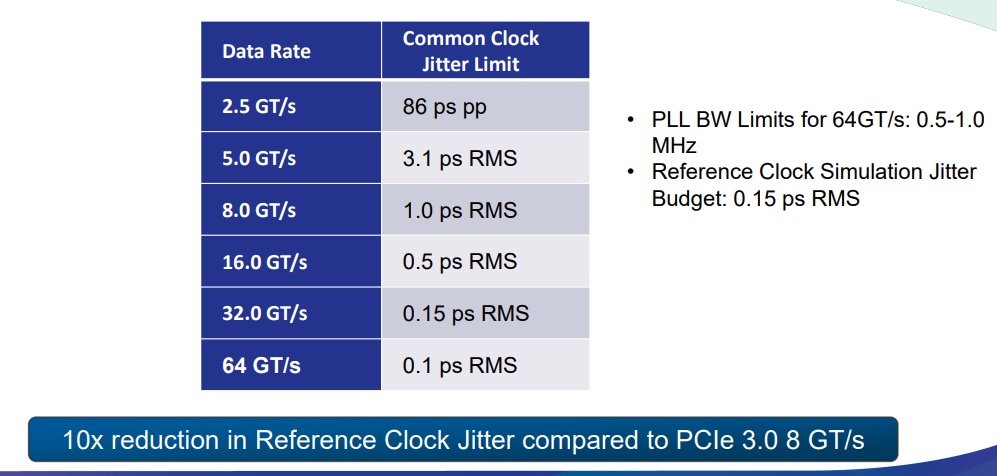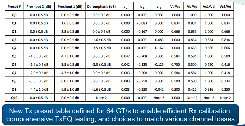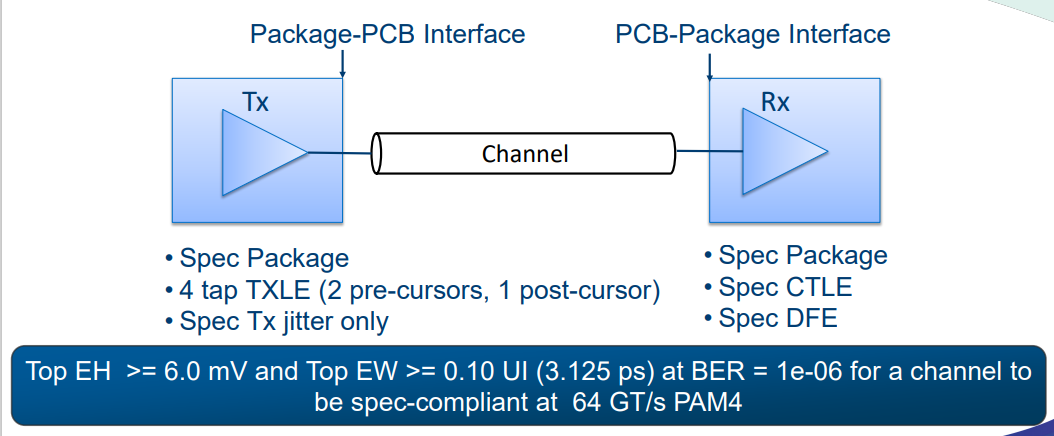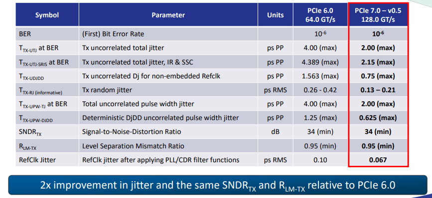 - Tx 지터: 32GT/s의 0.64배, 4탭 TxEQ, 개선된 CTLE 및 16탭 DFE 필요.