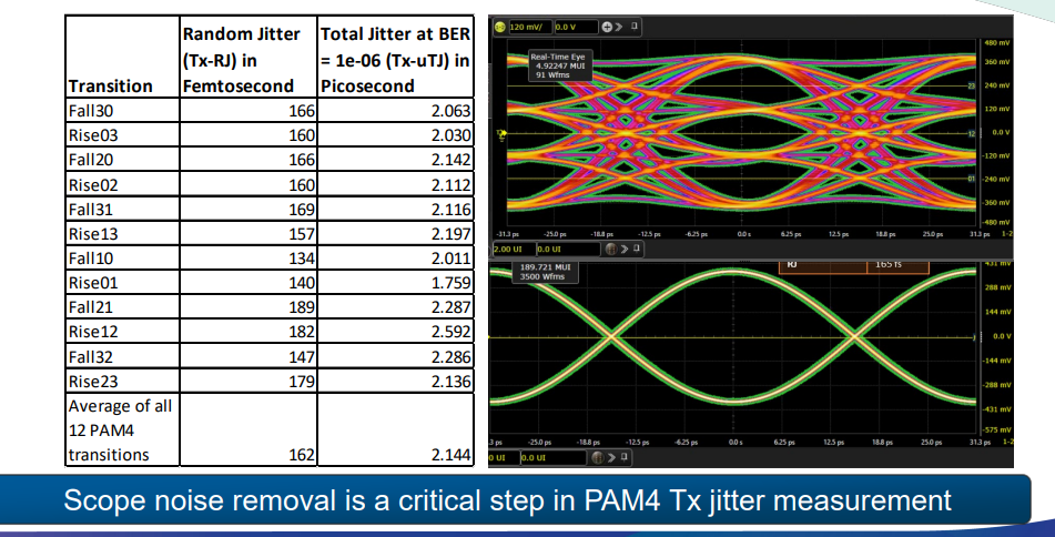 PAM4 신호에서 노이즈(혼선, 반사, 기타 노이즈 소스)에 대한 민감도는 주요 과제입니다. 신호 수준이 낮아지면서, 이러한 노이즈 요인들이 신호 품질에 더 큰 영향을 미치게 됩니다. 이를 해결하기 위해, 신호의 지터를 약 1.5배 줄이는 것이 필수적입니다. 지터 감소는 신호의 타이밍 오류를 줄이고, PAM4의 복잡한 전압 전환에서 발생하는 오류를 최소화하는 데 중요한 역할을 합니다.
