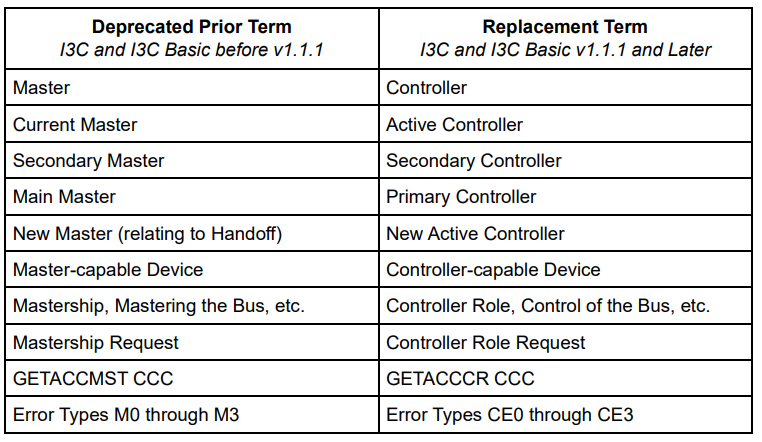 MIPI Alliance 전반의 용어 교체 노력의 일환으로, I3C v1.1.1 및 I3C Basic v1.1.1부터 Master와 Slave라는 용어가 폐기되었습니다. I3C v1.0/v1.1의 Master 장치는 이제 Controller로 불립니다. 이러한 I3C 장치나 I3C 버스에서의 역할에 대한 기술적 정의는 변경되지 않았습니다. "Controller"라는 용어가 I3C 버스에서의 장치 역할을 더 잘 설명하고, 더 정확한 표현이기 때문입니다.