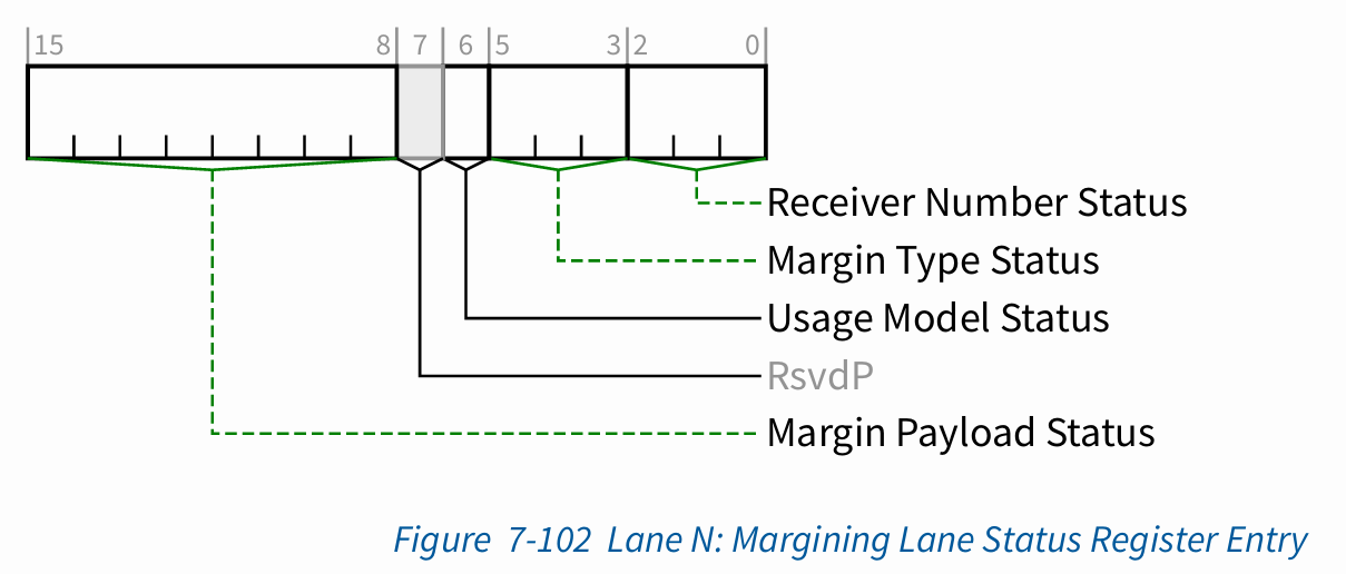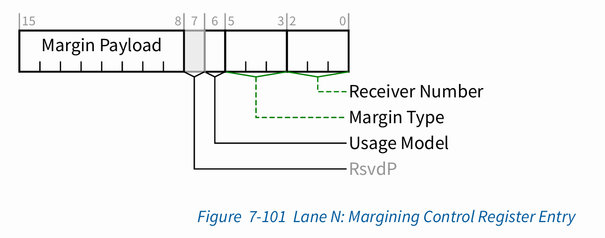 소프트웨어는 Lane Margining Lane Control Register와 Margining Lane Status Register를 각 포트(다운스트림 또는 업스트림)에서 사용하여 Margin Command를 전송하고 포트와 관련된 수신기의 상태 및 마진 상태 정보를 얻습니다.