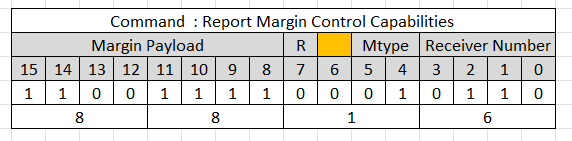 | Report Margin Control Capabilities | 001b | 001b through 110b | 88h | 001b | Margin Payload[7:5] = Reserved; Margin Payload[4:0] = {MIndErrorSampler, MSampleReportingMethod, MIndLeftRightTiming, MIndUpDownVoltage, MVoltageSupported} |