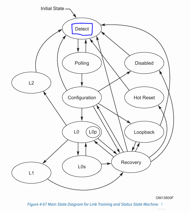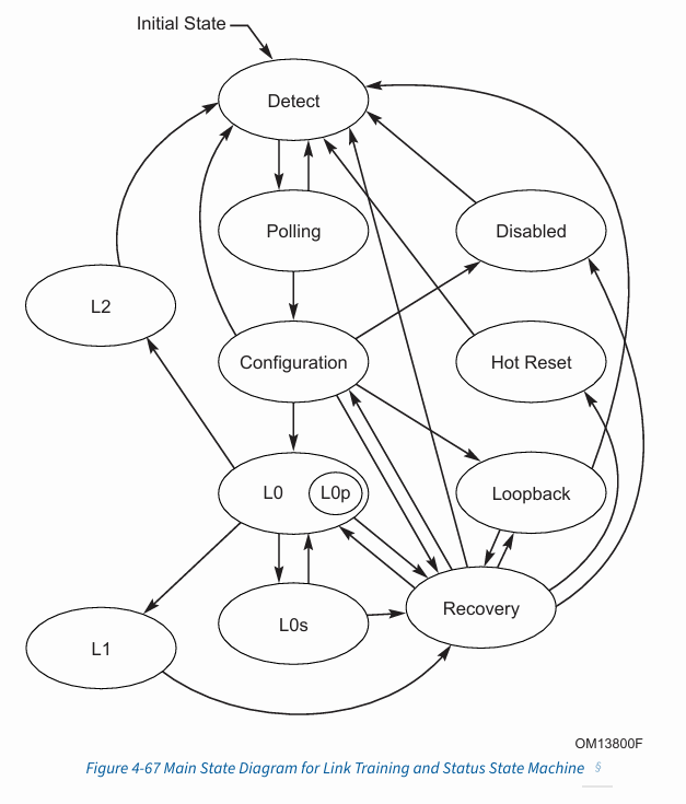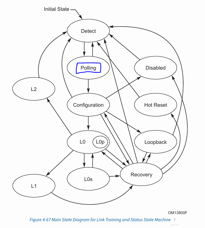 Polling State 지금까지 링크는 Electrical Idle(전기적 유휴) 상태에 있었습니다. 그러나 Polling 상태에서는 LTSSM TS1 및 TS2 Ordered Set이 두 개의 연결된 장치 간에 교환됩니다. 이 상태의 주요 목적은 두 장치가 서로의 신호를 올바르게 해석할 수 있도록 하는 것입니다. 즉, 각 장치가 상대방이 전송하는 비트 스트림을 인식하고, 비트 락(Bit Lock) 및 심볼 락(Symbol Lock)을 설정하며, 극성 반전(Polarity Inversion) 문제를 해결해야 합니다. 이 과정이 완료되면, 각 장치는 링크 파트너로부터 TS1 및 TS2 Ordered Set을 성공적으로 수신하게 됩니다. (이 과정의 하위 상태(Substate)에 대한 자세한 내용은 Fi..