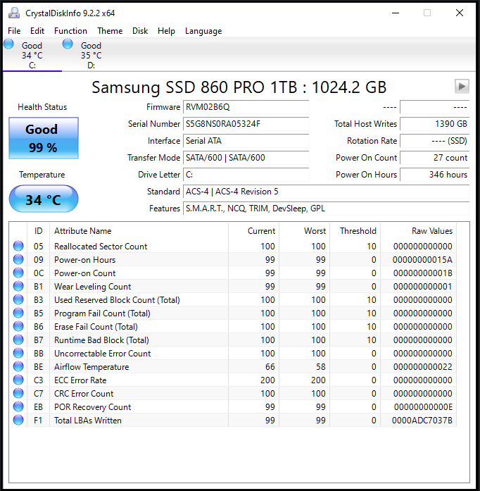 4.21 SMART (Self-monitoring, analysis, and reporting technology) feature set S.M.A.R.T.에서 보고한 "현재", "최악" 및 "임계값" 값 정규화된 정성적 값입니다. 즉, 실제 섹터 수 등을 나타내지 않습니다. 대신 해당 측정항목의 값이 척도로 "얼마나 좋은지" 또는 "얼마나 나쁜지"를 나타내기 위한 것입니다. "현재" 및 "최악" 숫자의 경우 높을수록 항상 더 좋으며 일반적으로 일부 공통 척도(예: 0-100)로 정규화됩니다. 불행히도 S.M.A.R.T.의 문제점 중 하나는 다음과 같습니다. 이러한 세부 사항 중 많은 부분이 표준에 지정되어 있지 않으므로 특정 제조업체가 이러한 값에 사용하는 척도는 전적으로 해당 제조업체에 달려 있습니다..